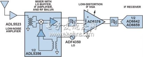 圖3顯示了超外差式接收機(jī)的一個(gè)通道,該器件采用以下元件:低噪聲放大器ADL5523具有LO緩沖器、IF放大器和RF巴倫的雙通道平衡混頻器 ADL5356;帶通或者低通濾波器;雙通道、超低失真IF VGAAD8376另一個(gè)低通或者帶通抗混疊濾波器;雙通道IF接收機(jī)AD6642