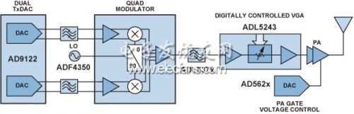 圖5顯示了超外差式或ZIF發(fā)射機(jī),該器件采用以下元件:TxDACAD9122、低通濾波器、正交調(diào)制器ADL537x、另一個(gè)RF濾波器、頻率合成器ADF4350、數(shù)字控制VGAADL5243、功率放大器、用于控制功率放大器(PA)柵極電壓的DACAD562x.