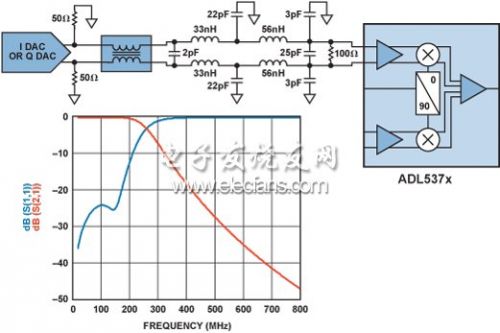 ADL5372的輸入電路需要0.5 V共模電壓,由流經(jīng)50 Ω電阻的10 mA直流電流提供。0 mA至20 mA交流電流由兩個(gè)50 Ω電阻和一個(gè)100 Ω電阻共享。因此調(diào)制器輸入的交流電壓為20 mA × ((50 × 2) || 100) = 1 V p-p。TxDAC與調(diào)制器之間的濾波器用于去除高頻雜散和諧波成分。濾波器的輸入和輸出阻抗為100 Ω。完整接口如圖6所示。