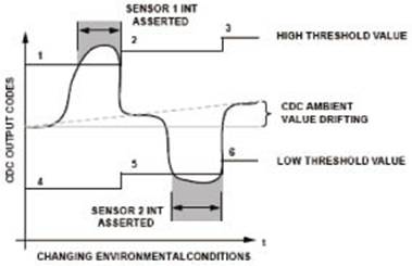 隨著環(huán)境條件的變化(例如,溫度或濕度上升),傳感器的環(huán)境參數(在用戶沒有與傳感器接觸期間,由CDC進行測量)會發(fā)生漂移。為了進行補償,需要動態(tài)改變高端和低端閾值電平,以確定有效的傳感器接觸。位置2、3、5、6處的參考電平進行重新調整,以保持最佳的閾值參考電平,從而自動跟蹤和補償漂移誤差。