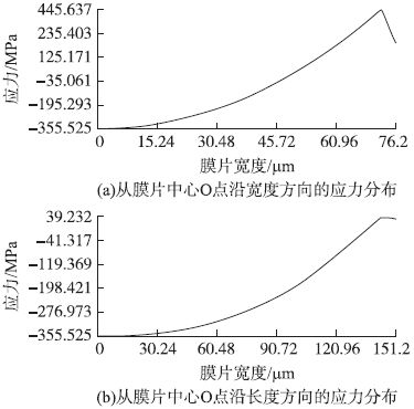 犧牲層厚度H2 < 1.6 μm 時,隨著犧牲層厚度的減小,使膜片與襯底剛好接觸所加載的壓力也隨之減小,當(dāng)犧牲層厚度減小使該加載壓力減小到剛好滿量程壓力時,犧牲層厚度不可再減小,否則傳感器在量程范圍內(nèi)將出現(xiàn)了非線性形變,這樣便確定了減小犧牲層厚度提高過載能力的極限值。經(jīng)過仿真,膜片長度a = 300 μm、寬度b = 150 μm、膜片厚度H1 = 3 μm 時,對應(yīng)的犧牲層厚度最小值為0.3μm。下面利用有限元分析軟件對此參數(shù)的壓力傳感器進(jìn)行非線性接觸分析。按照模型建立、網(wǎng)格劃分、接觸對建立、加載、求解的順序進(jìn)行模擬仿真。當(dāng)最大應(yīng)力達(dá)到硅的斷裂強(qiáng)度時,加載壓力為1.55MPa,仿真結(jié)果如圖4 所示,其中點(diǎn)O 處于膜片中心。