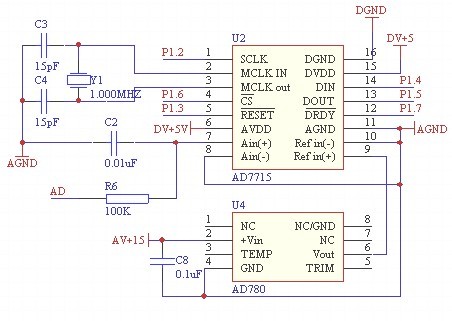 為了實現對微壓力的實時測量,使用 16 位的AD7715 對輸出電壓進行采樣測量,其中AD780 提供2.5V 高精度基準電壓。P3.1 腳提供了AD 工作所需的時鐘,P1.4 和P1.5 腳接收和發(fā)送通訊數據,P1.6 是片選信號,P1.7 接DRDY ,AT89S52 可以通過查詢P1.7 的狀態(tài)來判斷是否可以讀取AD 轉換結果。A/D 接口電路如圖3所示。