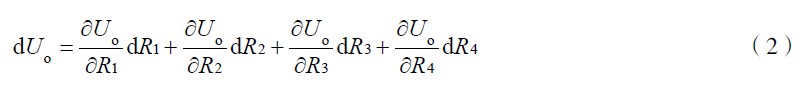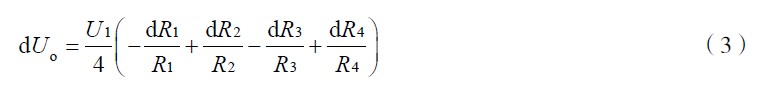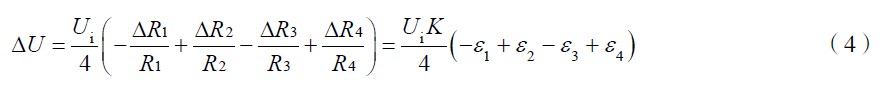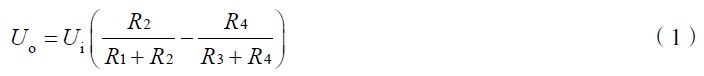式(4)為電橋轉換原理的一般形式。ΔU 為電橋輸出電壓。作為全等臂電橋, ΔR1 = ΔR2 = ΔR 3= ΔR4 ,式(4)變?yōu)?Delta;U =UKε 。