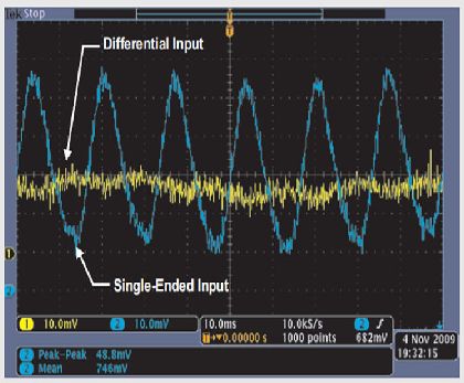 2、電荷放大器是一種非常敏感(高增益)的電路。圖17表明任何輸入干擾信號的電容耦合(此處為60Hz極板網(wǎng)柵)都會有效注入電流。就單端放大器而言,這意味著端子中的一個注入電流,而其他則接地;也就是說,放大器只會放大干擾信號。就差分輸入來說,施加于兩個端子的共模信號會相互抵消(假設寄生和反饋網(wǎng)絡相同)。圖18中,需要注意的是單端輸入(藍色軌跡)60Hz極板網(wǎng)柵的耦合結(jié)果,以及60Hz共模噪聲如何被干擾信號(黃色軌跡)相互抵消的差分輸入極大降低。本例中,為了方便理解,我們并沒有嘗試匹配超出10%組件容限的差動輸入。