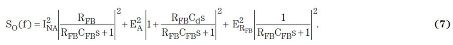 現(xiàn)在,請思考噪聲變化與反饋電阻的對比結(jié)果。將方程式7第一項的RFB從270 MΩ改為540MΩ(且把CFB除以2,從680 pF降至340pF,目的是保持極頻恒定),對輸出參考噪聲產(chǎn)生如下影響: