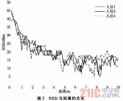 3個工作人員分別拿著移動終端在0~10 m的范圍內(nèi)勻速前進,得到的RSSI值與距離的關(guān)系如圖2所示。
