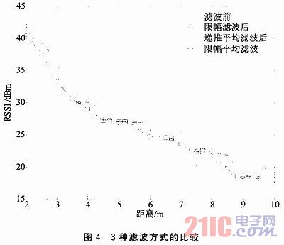 紅外線、GPS和超聲測距都需要額外的硬件,增加了節(jié)點的硬件成本和尺寸。GPS和紅外線測距誤差較大,而利用超聲方法測距很精確,測距誤差只有10 cm,但是受氣溫、濕度等的影響較大,不適合在室外使用?;赗SSI的定位無需額外硬件,利用對接收無線信號的強度判斷,推導(dǎo)收發(fā)節(jié)點間的距離,計算接收無線信號強度是商用無線收發(fā)芯片具備的功能?;赗SSI的測距提供了最廉價的定位方法,而且節(jié)點沒有添加任何部件?;诔暤臏y距雖然定位精度較高,但是需要添加硬件、增加節(jié)點成本和尺寸。所以,基于RSSI的測距是無線傳感器網(wǎng)絡(luò)定位較常采用的方法。首先對RSSI進行預(yù)處理,再通過預(yù)測模型預(yù)測距離的值,不但提高了基于RSSI的測距精度,而且實現(xiàn)了低成本的測距。