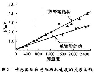 對制作的加速度傳感器樣品,在馬希特?fù)翦N上進(jìn)行了大量地沖擊標(biāo)定測試,測試結(jié)果表明:設(shè)計和加工制作的加速度計樣品在進(jìn)行加速度的沖擊時,有較好的信號輸出,單臂梁結(jié)構(gòu)的加速度計的靈敏度為1 μV/gn;雙臂梁結(jié)構(gòu)的加速度計的靈敏度為1.6μV/gn,與理論設(shè)計值基本吻合。