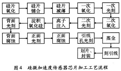 壓阻式傳感器的懸臂梁常采用CVD工藝在硅片上外延生長一層外延層刻蝕而成,文中試用鍵合工藝制造壓阻式加速度傳感器。采用鍵合工藝優(yōu)點是能得到高質(zhì)量的外延層,且懸臂梁的厚度通過硅片減薄工藝易于得到保證,精細(xì)的硅片單面研磨,厚度誤差可以控制在0.5 μm以內(nèi);且不需要電化學(xué)自停止腐蝕,依靠EPW腐蝕液對SiO2的腐蝕速度極慢,使得腐蝕過程停止在SiO2層上,從而保證了硅片減薄后的厚度即為彈性梁的厚度。制作的傳感器芯片尺寸3 mm×5 mm,封裝在陶瓷管殼中。選n型硅片,晶向(100),直徑為50mm,厚度為300μm,電阻率為5~12 Ω·cm。傳感器芯片加工工藝流程,如圖4所示。