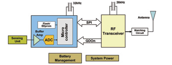每個(gè)無線傳感器都被看作一個(gè)節(jié)點(diǎn),擁有無線通信能力,同時(shí)還具有一定的信號(hào)處理與網(wǎng)絡(luò)數(shù)據(jù)的智能。根據(jù)應(yīng)用的類型,每個(gè)節(jié)點(diǎn)都可以有一個(gè)指定的地址。圖2顯示了某個(gè)節(jié)點(diǎn)的通用結(jié)構(gòu)圖。它一般會(huì)包括一個(gè)傳感裝置、一個(gè)數(shù)據(jù)處理微控制器,以及一個(gè)無線連接RF模塊。根據(jù)不同的網(wǎng)絡(luò)定義,RF模塊可以起到一個(gè)簡(jiǎn)單發(fā)射器或者收發(fā)器 (TX/RX)的作用。進(jìn)行節(jié)點(diǎn)設(shè)計(jì)時(shí),注意電流消耗和處理能力非常的重要。微控制器的內(nèi)存非常依賴于所使用的軟件棧。