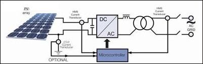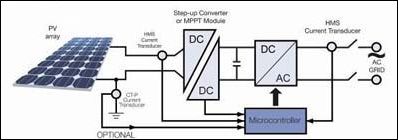 通常在剛好在PV 方陣后使用最大功率點跟蹤(MPPT)組件來確保方陣工作在其最大功率運行水平。通過使用用于跟蹤功能的電流和電壓傳感器,應用一種特殊軟件算法和專用電子元件一起來控制電池板(電池)的工作點。一般來說,一臺電流傳感器可用于測量單相輸出(供到電網(wǎng)的電流),而另一臺傳感器可用于測量輸入直流電流(10-25A)。在三相輸出的情況下,兩臺傳感器可用于測量三相輸出的交流電流。接入電網(wǎng)的DC/AC逆變器是一臺將直流信號轉(zhuǎn)換為正弦波的全橋逆變器。