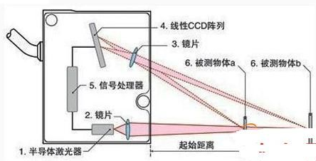 激光發(fā)射器通過鏡頭將可見紅色激光射向物體表面,經(jīng)物體反射的激光通過接受器鏡頭,被內(nèi)部的CCD線性相機(jī)接受,根據(jù)不同的距離,CCD線性相機(jī)可以在不同的角度下“看見”這個光點(diǎn)。根據(jù)這個角度即知的激光和相機(jī)之間的距離,數(shù)字信號處理器就能計(jì)算出傳感器和被測物之間的距離。