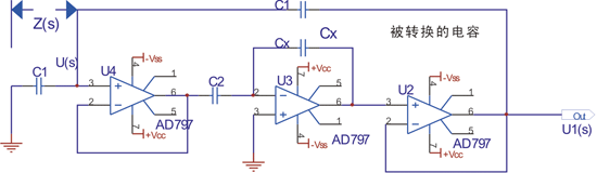 。如果 Rf 為常數(shù),則f是Cx(x)函數(shù),可根據(jù)測定f占空比,計(jì)算出Cx(x)的值。實(shí)際上,圖3電路僅可測量靜態(tài)電容,對于測量動態(tài)電容,必須對電路進(jìn)行改進(jìn), 對Cx的電荷轉(zhuǎn)移過程進(jìn)行保護(hù)。改進(jìn)的方法是用電容性有源網(wǎng)絡(luò)在電路中來代替Cx,如圖4所示。U3是電荷轉(zhuǎn)移放大器,是網(wǎng)絡(luò)的中心;U2是跟隨器;U4是保持器,電路靜態(tài)諧振頻率以38KHz~40KHz為好。