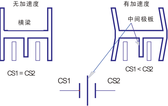 如圖5所示,中間極板(即橫梁的伸出部分)與二個固定的外極板組成差動電容 CS1和CS2。沒有加速度時(shí),CS1=CS2;產(chǎn)生加速度時(shí),橫梁的移動改變了中間極板和固定的外極板之間的相對位置,引起電容變化,CS1≠CS2。通過測量電路,將電容的變化在外加交流電壓的激勵下轉(zhuǎn)化為電學(xué)量,能夠測得該物體相應(yīng)的瞬時(shí)速度或瞬時(shí)加速度值。