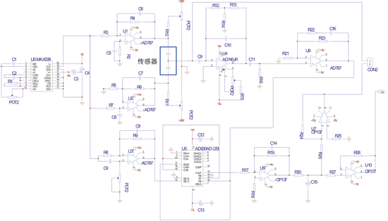具體電路如圖7所示:U0(MAX038)信號發(fā)生器芯片產(chǎn)生1MHz的正弦交流信號;U1(AD797)運(yùn)算放大器組成反相比例放大器,U2(AD797)運(yùn)算放大器組成同相比例放大器。1MHz的交流信號經(jīng)U1、U2后,變?yōu)榇笮∠嗟?、方向相反、相位相?80o的二個交流激勵信號,用來激勵差分電容傳感器;U4(AD745JR)是高輸入阻抗電荷轉(zhuǎn)移放大器。U4是調(diào)理電路的中心,在外加激勵信號的作用下,傳感器振動引起的電荷轉(zhuǎn)移成電壓信號的變化。R12、R13、R14采用T型連結(jié),目的是提升電路阻抗和電路系統(tǒng)放大倍數(shù)。U6(AD797)運(yùn)算放大器是 將C11、R16組成的高通濾波器去除低頻干擾后的電壓信號經(jīng)適當(dāng)放大,為下一步同步解調(diào)作好準(zhǔn)備;U3(AD797)運(yùn)算放大器組成的移相電路,其作用是使調(diào)制信號和解調(diào)信號同步;U5同步解調(diào)器,采用ADI公司生產(chǎn)的平衡解調(diào)器AD630,經(jīng)U5同步解調(diào)出的電壓信號就是反應(yīng)振動加速度大小的信號;U9(OP137)運(yùn)算放大器組成二階有源低通濾波器,濾除信號中高頻噪音成份;U10(OP177)運(yùn)算放大器組成 跟隨器,信號經(jīng)調(diào)整后跟隨輸出。