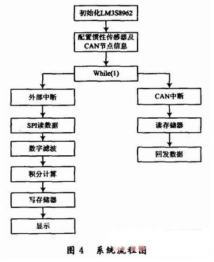 微控制器直接控制慣性傳感器的工作狀態(tài)并采集角速度、角加速度等信息,為了達到處理的實時性,當(dāng)ADIS16365有數(shù)據(jù)需要發(fā)送時,中斷通知微控制器進行讀取。微控制器將采集到的數(shù)據(jù)進行積分及濾波處理,并將處理后的信息存儲在片內(nèi)FLASH中。當(dāng)微控制器接收到數(shù)據(jù)請求時,通過CAN總線發(fā)送數(shù)據(jù)。圖4為系統(tǒng)主流程圖?! ?/p>