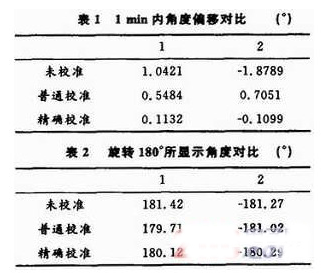 ADIS16365擁有較為完善的數(shù)據(jù)處理方案,經(jīng)測試,使用其內(nèi)部校正功能可以明顯改善系統(tǒng)性能。根據(jù)寫入GLOB_CMD寄存器命令的不同,可以采用不同的處理方法。表1和表2列出了內(nèi)部普通校準(zhǔn)和精確校準(zhǔn)與未校準(zhǔn)數(shù)據(jù)的比較。