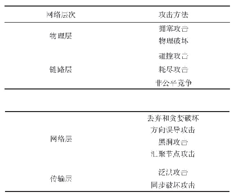 無(wú)線傳感器網(wǎng)絡(luò)(WSN)易受各種安全威脅,許多文獻(xiàn)勻有描述。文獻(xiàn)將WSN的攻擊按照不同層次分類,如表1所示。