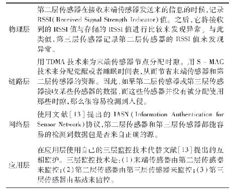 修改了Da Silva等人提出的入侵檢測(cè)算法,并將它運(yùn)用在第二和第三層傳感器上。由于傳感器資源有限,沒(méi)有在任何末端傳感器上運(yùn)用IDS.監(jiān)控節(jié)點(diǎn)的功能被分成三個(gè)階段。第一階段:所有的末端傳感器從它們周圍環(huán)境收集數(shù)據(jù),然后報(bào)告給第二層傳感器。第二階段:用基于分層的攻擊檢測(cè)方法來(lái)檢測(cè)文獻(xiàn)提出的攻擊類型。表2描述了攻擊在各層中如何被發(fā)現(xiàn)的。這種基于分層的攻擊檢測(cè)方法使得系統(tǒng)更完善。第三階段:比較每個(gè)上報(bào)的結(jié)果來(lái)定義閾值,以此來(lái)決定是否要發(fā)出一個(gè)報(bào)警。第三階段常常可以減少錯(cuò)報(bào)率。閾值可以人工定義或者根據(jù)特定的WSN需求來(lái)調(diào)整。因此,提出的入侵檢測(cè)體系結(jié)構(gòu)通過(guò)減少錯(cuò)報(bào)能夠檢測(cè)到大多數(shù)的安全威脅。