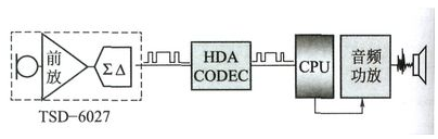 數(shù)字傳聲器,顧名思義就是直接輸出數(shù)字脈沖信號的傳聲器電聲器件。從應用角度來劃分,可以分為兩類:一類為USB接口的數(shù)字傳聲器,其核心電聲換能器件仍為模擬音頻輸出信號,經(jīng)過USB接口音效芯片轉換為PC格式的數(shù)字信號輸出接口,此類傳聲器多數(shù)作為PC周邊配套外設,如USB接口錄音傳聲器、USB接口耳麥等,嚴格說來,此類數(shù)字傳聲器應稱為數(shù)字接口傳聲器。另一類為真正意義上的數(shù)字傳聲器,此類傳聲器采用內(nèi)置阻抗變換、前置增益、A/D編碼器的IC芯片,作為電聲換能器件直接輸出的便是脈沖數(shù)字信號,可以直接與相應的編解碼芯片( CODEC)進行數(shù)字信號的傳輸。數(shù)字傳聲器接口原理如圖1