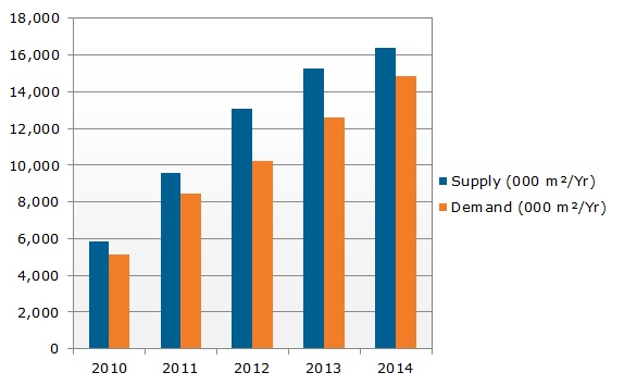 根據(jù)NPD DisplaySearch觸控感應(yīng)器產(chǎn)能統(tǒng)計報告Touch Sensor Manufacturing Capacity指出,2011年主要的觸控傳感器,包含電阻式、投射式電容、單片式投射式電容(sensor-on-cover)和面板內(nèi)嵌式投射式電容(on-cell)觸控感應(yīng)器的總產(chǎn)量為960萬平方米,較2010年的580萬平方米取得了66%的年增長率。NPD DisplaySearch預(yù)測,2012年觸控感應(yīng)器將達到1千3百萬平方米,并將于2014年上升到1千640萬平方米。