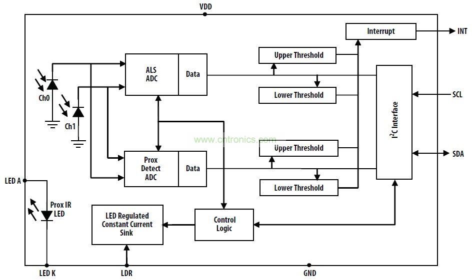 APDS-9901 在單個(gè) 8 引腳封裝內(nèi)提供數(shù)字環(huán)境亮度和近接式傳感器 (ALS)、紅外 LED 和完整的近接式檢測(cè)系統(tǒng)。近接功能可進(jìn)行 100 毫米即插即用檢測(cè)(無(wú)需擋風(fēng)玻璃)因此減少了終端設(shè)備或子裝配的工廠校準(zhǔn)需要。從明亮的陽(yáng)光照射到黑暗的房間,近接檢測(cè)功能都能運(yùn)作良好。寬動(dòng)態(tài)范圍也允許,如手機(jī)的暗色玻璃后進(jìn)行短距離檢測(cè)操作。此外,內(nèi)部狀態(tài)機(jī)具有能將設(shè)備放置于 ALS 和近接測(cè)量之間的低功率模式的能力,提供極低的平均功耗。ALS 能在極低的光線條件或深色的面板后對(duì)亮度做出適光反應(yīng)。