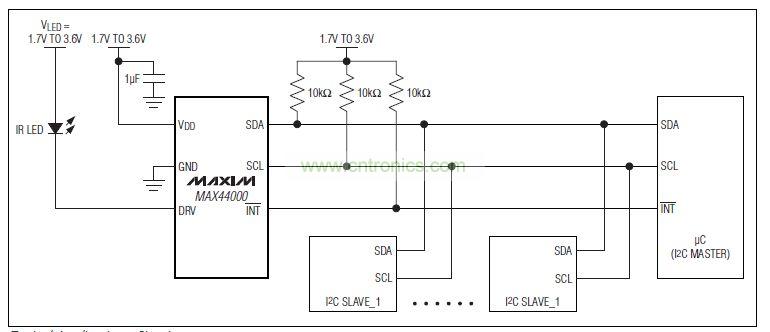 MAX44000設(shè)計(jì)用于驅(qū)動外部IR LED,工作在1.7V至3.6V VDD供電電源。只有環(huán)境光傳感器工作時(shí),器件消耗5µA電流,使能接近檢測接收器和驅(qū)動器后,器件僅消耗7µA電流。