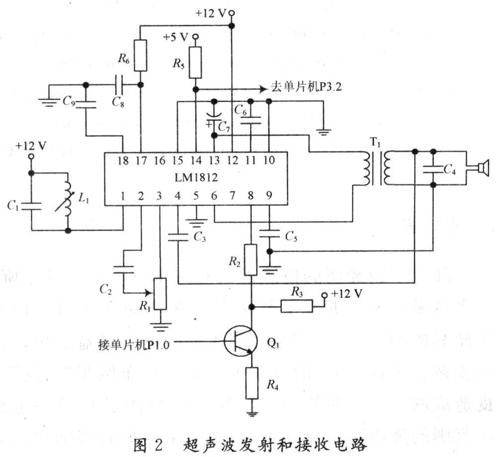 超聲波發(fā)射和接收電路如圖2所示。當(dāng)LM1812的8腳為高電平時(shí),LM1812處于發(fā)射模式;當(dāng)8腳為低電平時(shí),LM1812處于接收模式。值得注意的是,單片機(jī)到LM1812的連接要進(jìn)行5~12 V的電平轉(zhuǎn)換。當(dāng)LM1812處于發(fā)射模式時(shí),L1,C1振蕩槽路被切換為振蕩模式,振蕩信號經(jīng)驅(qū)動(dòng)放大后,由13腳及6腳輸出。6,13腳之間所接變壓器線圈的匝數(shù)比是根據(jù)TCF40-25TR1型收發(fā)一體式超聲波傳感器的阻抗來確定的。實(shí)驗(yàn)證明,變壓器線圈的匝數(shù)比大約為4:1時(shí)可實(shí)現(xiàn)與超聲波發(fā)送器阻抗相匹配。超聲波接收器接收到的超聲波信號經(jīng)電容耦合由4腳輸入,再經(jīng)內(nèi)部兩級放大后同由1腳的諧振回路取出的信號一起送到檢測器。當(dāng)檢測到超聲波回波信號時(shí),LM1812的14腳(與單片機(jī)的INT0端相連)變?yōu)榈碗娖剑箚纹瑱C(jī)的T0計(jì)數(shù)器停止計(jì)數(shù)。