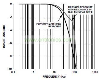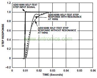 確定傳感器步進(jìn)響應(yīng)對于隔離在確定帶寬特性時觀察到的諧振條件很有用。圖1所示為一種采用ADIS16080的系統(tǒng)的頻率響應(yīng)。圖中所示諧振頻率為100 Hz。開始時,該諧振到底是傳感器行為導(dǎo)致,還是系統(tǒng)中的機(jī)械諧振所導(dǎo)致,這并不清楚。幸運的是,步進(jìn)響應(yīng)(如自測功能所確定)可以區(qū)分這兩種效應(yīng)。圖2顯示了兩種條件下的坐標(biāo)曲線圖:測試設(shè)置導(dǎo)致的諧振和傳感器本身導(dǎo)致的諧振。