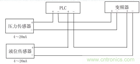 對(duì)于傳感器輸出的電流信號(hào),只經(jīng)PLC和變頻器的輸入阻抗之和不大于傳感器的輸出負(fù)載阻抗即可,壓力傳感器的信號(hào)可以同時(shí)串入PLC和變頻器,如只有壓力傳感器信號(hào),則PLC和變頻器也都可以正常接收壓力傳感器的信號(hào)。而當(dāng)液位傳感器的信號(hào)也同時(shí)接入PLC和變頻器時(shí),因PLC接收信號(hào)的-端都在變頻器的+端,當(dāng)兩傳感器的信號(hào)電流不一樣時(shí),就有可能使PLC兩-端的電位有較大的差異,就就形成了共模干擾電壓。如PLC輸入端又互相不是隔離的,則會(huì)造成PLC的模擬信號(hào)輸入端接收不正常。變頻器的兩輸入信號(hào)是在PLC的后面,其-端電位可保持在變頻器內(nèi)部電路設(shè)定的狀態(tài),問(wèn)題不大。