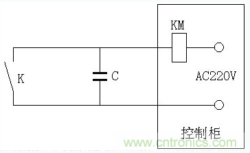 由于開(kāi)關(guān)K離接觸器KM較遠(yuǎn),兩根電線很長(zhǎng)導(dǎo)致其分布電容C將變得很大,在交流電路中,這個(gè)分布電容中將有位移電流流過(guò),即使開(kāi)關(guān)K斷開(kāi)也可能因KM維持能量不需太大而導(dǎo)致KM不釋放,設(shè)備停不下來(lái),此時(shí),可以按以下方法解決: