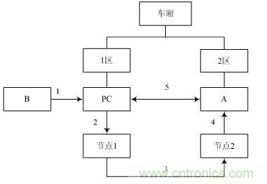 系統(tǒng)設(shè)計(jì)方案非常簡單。一般來講火車車廂全長26.6 m ,而無線傳感器網(wǎng)絡(luò)(wireless sensor net2works ,WSN)的通信距離在幾十米到幾百米之間,一般為30 m ,因此一個節(jié)點(diǎn)就可以完全覆蓋整個車廂。在系統(tǒng)中只有2個節(jié)點(diǎn)(不需PC協(xié)助) :節(jié)點(diǎn)1作為發(fā)信者,節(jié)點(diǎn)2作為收信者,組成最簡單的網(wǎng)絡(luò),不需跳轉(zhuǎn)。系統(tǒng)的結(jié)構(gòu)簡單,使得傳輸時延非常小,比較適合應(yīng)用在上文中提到的場合。