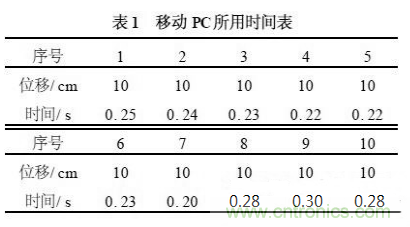 現(xiàn)在通過簡單實(shí)驗(yàn)獲取數(shù)據(jù)來計(jì)算人為移動引起的az :隨意從桌上拿起筆記本,重復(fù)10次,記錄短距離10 cm)所用時間。得到10組數(shù)據(jù)如表1所示。
