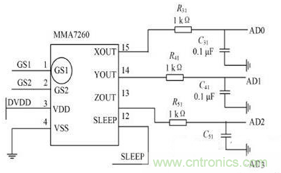 本無線采集系統(tǒng)采用了Freescale 公司最新推出的一款低成本、單芯片、三軸加速度傳感器MMA7260.該微型電容式加速傳感器融合了信號調(diào)理、單極低通濾波器和溫度補(bǔ)償技術(shù),提供了4 種加速度測量范圍,分別為±1.5 g , ±2 g , ±4 g 和±6 g.考慮到前文將閾值定為0.2 g ,故設(shè)置參數(shù)將測量范圍定為±1.5 g.在CC1010 與MMA7260 的接口中,首先要考慮噪聲問題。因?yàn)镸MA7260 內(nèi)部采用了開關(guān)電容濾波器, 有時鐘噪聲產(chǎn)生, 所以需要在MMA7260 的XOU T ,YOU T 和ZOU T 三個輸出端分別接RC 濾波器;其次要考慮電壓匹配問題,由于x , y , z 軸方向的電壓輸出是0.45~2.85 V ,CC1010 的ADC 最大輸入范圍是0~V DD .此處,V DD = 3.3 V ,其范圍恰好在ADC的輸入范圍之內(nèi), 所以不用考慮額外的分壓電阻。CC1010 和MMA7260 的接口電路如圖3 所示。R31 / C31 , R41 / C41 , R51 / C51 用于濾除MMA7260 內(nèi)部采樣的開關(guān)噪聲,GS1 ,GS2 用于量程選擇。