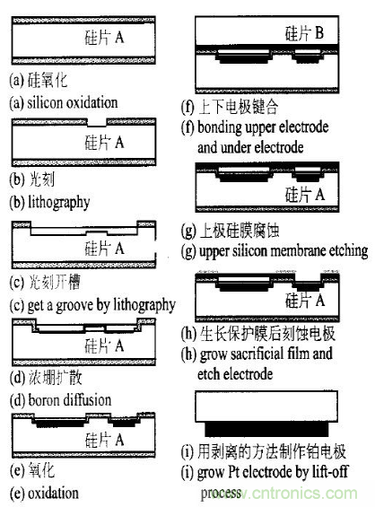 硅電容式壓力傳感器的敏感元件是半導體薄膜,它可以由單晶硅、多晶硅等利用半導體工藝制作而成。典型的電容式傳感器由上下電極、絕緣體和襯底構成。當薄膜受壓力作用時,薄膜會發(fā)生一定的變形,因此,上下電極之間的距離發(fā)生一定的變化,從而使電容發(fā)生變化。但電容式壓力傳感器的電容與上下電極之間的距離的關系是非線性關系,因此,要用具有補償功能的測量電路對輸出電容進行非線性補償。由于高溫壓力傳感器工作在高溫環(huán)境下,補償電路會受到環(huán)境溫度的影響,從而產生較大的誤差?;谀P妥R別的高溫壓力傳感器,正是為了避免補償電路在高溫環(huán)境下工作產生較大誤差而設計的,其設計方案是把傳感器件與放大電路分離,通過模型識別來得到所測環(huán)境的壓力。高溫工作區(qū)溫度可達350 ℃。傳感器件由鉑電阻和電容式壓力傳感器構成。其MEMS 工藝如下: