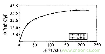 表1 可見,擬合的電容誤差小于1 %。由此可見,在不同的時刻測得UO ( t) ,通過曲線擬合得出參數RC。再給電路加小信號直流電源,測出R 值,即求得C ,通過C 值則可知被測環(huán)境的壓力。圖5為350 ℃時,不同的壓力對應的電容的理論值和實驗值,從實驗數據(表2) 可得,在測壓的過程中,利用模型識別的方法,誤差較小,其測壓誤差小于2 %。