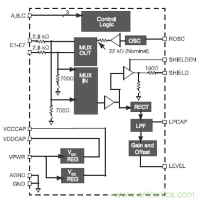 PCB還可能受到寄生電容的影響,這種電容最大可達20pF,它會在電容觸摸傳感器視為受到按壓時,使閾值發(fā)生偏移,從而改變其靈敏度。為了對寄生電容進行補償,可以采用對DAC編程的方法,以抵消CDC的輸入。對于各PCB來說,這種寄生電容是一致的,因此可以在制造PCB的時候進行簡單的調(diào)整,這樣就不需要外部RC調(diào)諧元件,從而使材料、裝配和測試相關(guān)的成本最低。單獨調(diào)整每個傳感器的偏移,使設(shè)計者可以充分利用轉(zhuǎn)換器的分辨率。