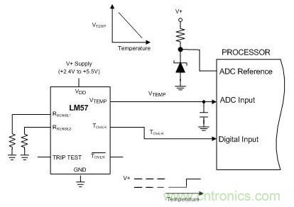 處理器的模數(shù)轉(zhuǎn)換器用于采集溫度模擬電壓(VTEMP)。當溫度超出臨界值時,過熱(TOVER)輸出端會驅(qū)動處理器的輸入端進行指示。跳脫點由兩個無源電阻器(RSENSE1和RSENSE2)設(shè)置,而不是由有效參考端和偏壓電阻器設(shè)置。