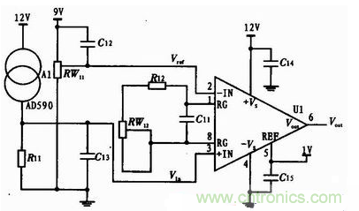 AD590是集成溫度傳感器,輸出為電流,相當于恒流源,若要對此進行放大需先轉換為電壓,可在其回路串入電阻,根據(jù)歐姆定律,電阻上電壓的大小可反映電流的大小,也就是溫度的高低。圖2是溫度傳感器AD590的信號調(diào)理變換電路