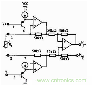 測量300℃的傳感器用Pt1000的鉑電阻,測量范圍:-50~300℃:0℃時電阻阻值1 000 Ω,300℃時電阻阻值2 120.515 Ω,反映溫度的物理量是電阻,因此需要設計電橋?qū)㈦娮璧淖兓哭D換位差模電壓的變換量,然后進行信號放大和電平抬升。
