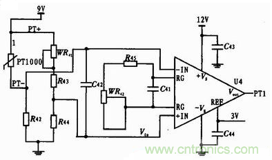 圖4中WR41是調(diào)零電位器;電橋的輸出直接連接運放AD623,其連接和調(diào)節(jié)增益方法和上節(jié)中相同這里不再介紹。調(diào)試時PT1000用電阻箱實現(xiàn)的,阻值由分度表獲得的。