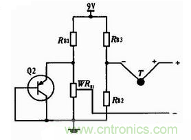 本設計采用晶體管PN結溫度特性進行冷端補償,冷端補償電路和熱電偶串聯(lián),如圖5所示。圖中T為熱電偶,其他為冷端補償電路,晶體管選用三極管9012,其電壓溫度變化率約為-2.1 mV/℃,3個電阻、電位器和PNP三極管組成電橋。當冷端溫度升高時,PN結壓降降低,WR81滑動頭電勢降低,WR82和R83中間電勢不變,電橋輸出增大,補償了熱電偶冷端的溫漂,當溫度降低則相反。電路的輸出直接連在運放AD623的輸入端。