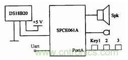 綜上所述,整體硬件電路組成如圖1所示,由SCPE061A單片機(jī)實(shí)現(xiàn)系統(tǒng)整體控制并實(shí)現(xiàn)語音或鍵盤編程與語音播報(bào),系統(tǒng)可通過通用異步串行接口實(shí)現(xiàn)聯(lián)網(wǎng)功能,在不需要聯(lián)網(wǎng)的場(chǎng)合,溫度計(jì)也可以單獨(dú)使用,實(shí)現(xiàn)了系統(tǒng)的可裁剪,DSl8B20用來實(shí)現(xiàn)溫度檢測(cè)。
