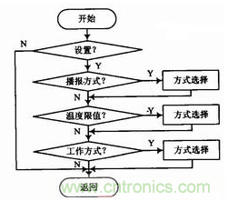 可設(shè)置的參數(shù)主要有,播報(bào)方式:“連續(xù)、隔x秒、禁止”;報(bào)警溫度值;工作方式等。在需要實(shí)時(shí)關(guān)注溫度值的時(shí)候,可以設(shè)置為連續(xù)播報(bào);溫度變化較慢的時(shí)候可以設(shè)置為隔x秒方式;夜晚設(shè)置報(bào)警模式后,可以設(shè)置為禁止播報(bào)模式。設(shè)置報(bào)警溫度值后可以,可以處理其他事情,在出現(xiàn)警情時(shí),系統(tǒng)給出報(bào)警,提示用戶。選擇工作方式為“聯(lián)網(wǎng)工作”后,系統(tǒng)除了現(xiàn)場(chǎng)播報(bào)和報(bào)警外,還將相應(yīng)信息通過異步串行口發(fā)送到遠(yuǎn)端。設(shè)置過程全部采用語音菜單方式,可以大幅度較低成本,設(shè)置流程圖如圖2所示。