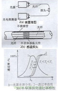 位圖2(a)為半導(dǎo)體吸光型(傳光型)光纖溫度傳感器示意圖。將一根切斷的光導(dǎo)纖維裝在細(xì)鋼管內(nèi),光纖兩端面間夾有一塊半導(dǎo)體感溫薄片(如GaAs或InP),這種半導(dǎo)體感溫薄片透射光強(qiáng)隨被測(cè)溫度而變化。因此,當(dāng)光纖一端輸入一恒定光強(qiáng)的光時(shí),由于半導(dǎo)體感溫薄片透射能力隨溫度變化,光纖另一端接收元件所接受的光強(qiáng)也隨被測(cè)溫度而改變。于是通過(guò)測(cè)量光探測(cè)器輸出的電量,便能遙測(cè)到感溫探頭2(b)處的溫度。
