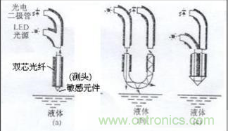光纖液位傳感器的工作原理如圖3(b)所示。發(fā)光器件射出來(lái)的光通過(guò)傳輸光纖送到敏感元件,在敏感元件的球面上,有一部分透過(guò),而其余的光被反射回來(lái)。當(dāng)敏感元件與液體相接觸時(shí),與空氣接觸相比,球面部的光透射量增大,而反射量減少。因此,由反射光量即可知道敏感元件是否接觸液體。反射光量決定于敏感元件玻璃的折射率和被測(cè)定物質(zhì)的折射率。被測(cè)物質(zhì)的折射率越大,反射光量越小。來(lái)自敏感元件的反射光,通過(guò)傳輸光纖由受光器件的光電晶體管進(jìn)行光電轉(zhuǎn)換后輸出。敏感元件的反射光量的變化,若以空氣的光量為基準(zhǔn),在水中則為-6-—7dB,在油中為-25—30dB??蓪?duì)反射光量差別很大的水和油等進(jìn)行物質(zhì)判別。