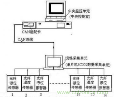 圖5所示可知,監(jiān)測(cè)系統(tǒng)分別由中央控制式的中央監(jiān)控單元和現(xiàn)埸采集單元(或數(shù)據(jù)采集單元)組成。現(xiàn)埸采集單元對(duì)油罐的液位、溫度信號(hào)進(jìn)行數(shù)據(jù)的實(shí)時(shí)采集,同時(shí)完成數(shù)據(jù)統(tǒng)計(jì)、存貯;中央監(jiān)控單元可以定期或不定期地從現(xiàn)埸采集單元獲取數(shù)據(jù)并完成圖像監(jiān)測(cè)、數(shù)據(jù)統(tǒng)計(jì)、報(bào)表、打印及數(shù)據(jù)庫(kù)管理。而中央監(jiān)控單元和現(xiàn)埸采集單元之間通過(guò)CAN總線連接在一起,在這個(gè)網(wǎng)絡(luò)中,中央監(jiān)控單元處于主控位置,而現(xiàn)埸采集單元可以隨時(shí)響應(yīng)中央監(jiān)控單元的命令。其現(xiàn)埸采集單元由單片機(jī)8C552及采集、存儲(chǔ)、顯示、遙控和通信模塊組成,每個(gè)現(xiàn)埸采集單元可與光纖液位傳感器、光纖溫度傳感器及光纖液位報(bào)警器等16個(gè)設(shè)備相接。之所以應(yīng)用CAN總線網(wǎng)絡(luò)結(jié)構(gòu)是內(nèi)由于CAN網(wǎng)絡(luò)具有的方便靈活、突出特性,抗干擾性、可靠性、實(shí)時(shí)性等特點(diǎn)。所有的光纖液位傳感器、光纖溫度傳感器及光纖液位報(bào)警器都可以通過(guò)一對(duì)雙絞線串接在一起,節(jié)省了空間、簡(jiǎn)化了布線。