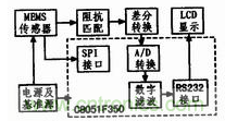 設(shè)計中采用C8051F350的24位Sigma-Delta模/數(shù)轉(zhuǎn)換器作系統(tǒng)信號的模數(shù)轉(zhuǎn)換,SPI接口作MEMS傾角傳感器的溫度采集,以實現(xiàn)對傳感器的溫度補償,UART作串行LED顯示接口。為保證模/數(shù)轉(zhuǎn)換器工作穩(wěn)定,采用外部基準源。