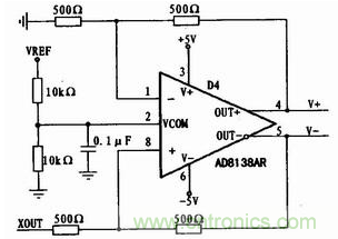 如圖3所示,差分轉(zhuǎn)換電路以AD8138AR為核心,將單端信號轉(zhuǎn)換差分信號,既可以提高共 模抑制比,有效減小共模信號影響,又可以驅(qū)動SOC內(nèi)部的24位差分Sigma-Delta模/數(shù)轉(zhuǎn)換器。AD8138AR具有較寬的模擬帶寬(320 MHz,-3 dB。增益為1時),而且AD8138AR為表面封裝器件,器件體積小,使得ADC與信號輸入點的距離可以很近,大大減少了外界噪聲的影響。