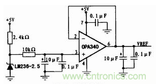 MEMS傾角傳感器SCA100T在傾角為0°時,模擬輸出為其電源電壓的1/2倍,如果傾角傳感器電源電壓有波動,則其輸出會產(chǎn)生相應(yīng)的波 動。因此設(shè)計時,將給模數(shù)轉(zhuǎn)換電路提供基準源的輸出(如圖4所示),經(jīng)過提高驅(qū)動能力后,提供給MEMS傾角傳感器SCA100T作電源(如圖5所示)。 一方面,基準源輸出紋波極小,且性能穩(wěn)定;另一方面,模數(shù)轉(zhuǎn)換器的基準源和MEMS傾角傳感器SCA100T的電源同時向相同方向變化,抵消了MEMS傾 角傳感器因電源引起零點漂移的影響。